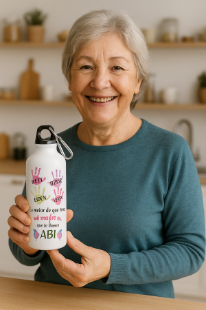 Material: aluminio de alta calidad. Tapón de plástico negro, libre de Bisfenol A (BPA Free). Con anilla y mosquetón de metal para colgarlas en el bolso o la mochila. Mantiene la temperatura de las bebidas frías o calientes durante horas. Capacidad: 600 ml. Todas nuestras botellas se pueden personalizar con nombres, frases o diseños a tu elección.