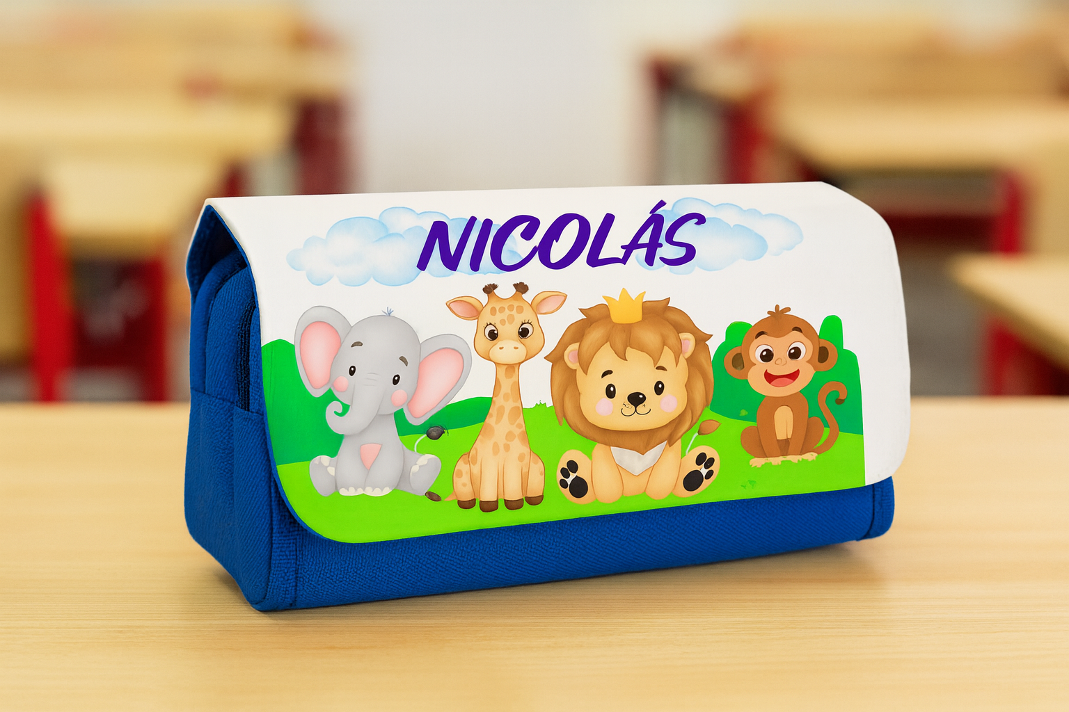 Con compartimentos especiales para guardar material escolar. Material: Loneta y poliéster. Cierre de solapa con velcro. Tiene tres compartimentos con cierre de cremallera: 2 bolsillos con fuelle y 1 compartimento de apertura completa con gomas elásticas para guardar material escolar. Todos nuestros estuches son totalmente personalizables a tu gusto con imágenes y nombres.